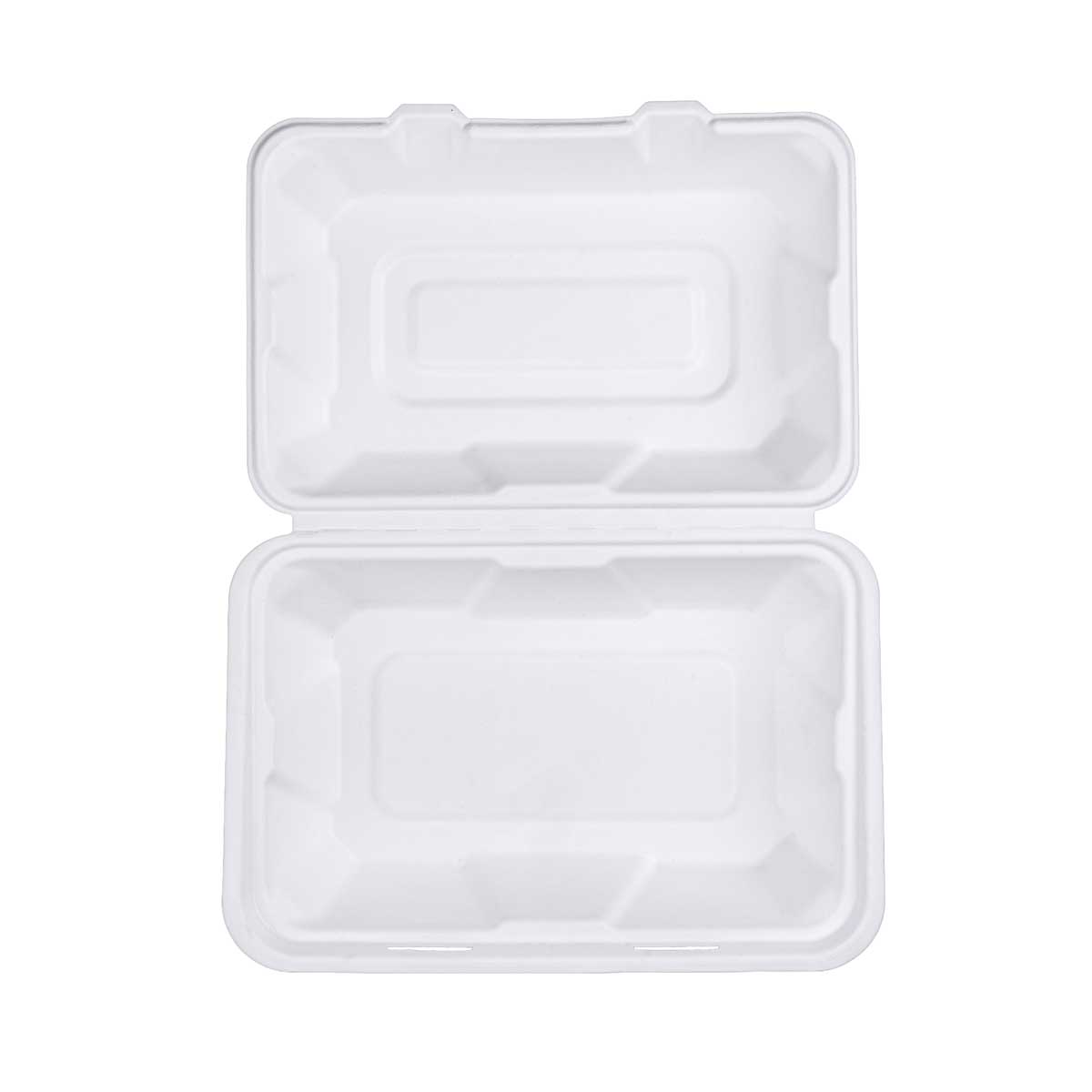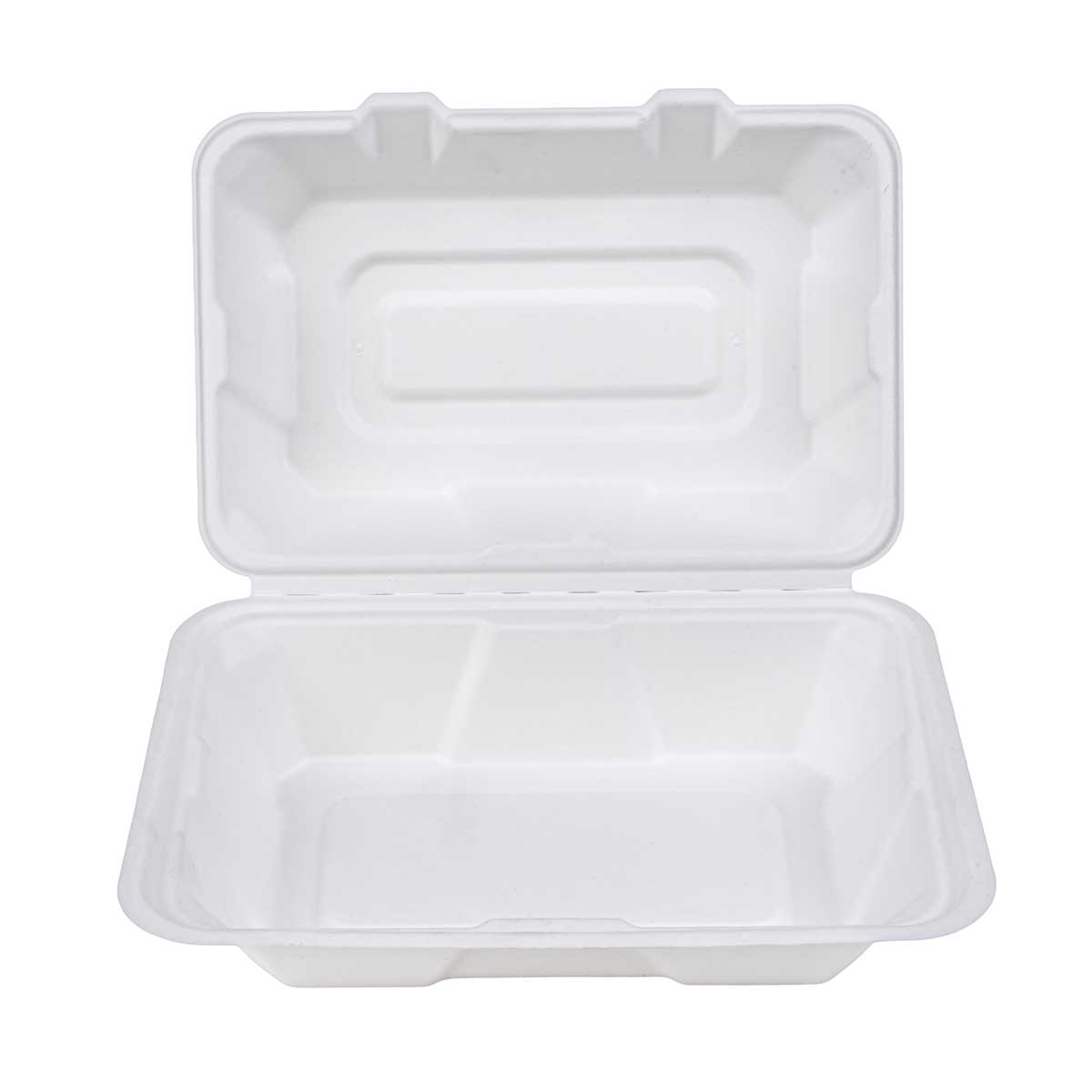 A sturdy sugarcane bagasse clamshell container designed for portioned meal service. Suitable for meals that require clear separation, heat handling, and reliable structure during service and delivery.