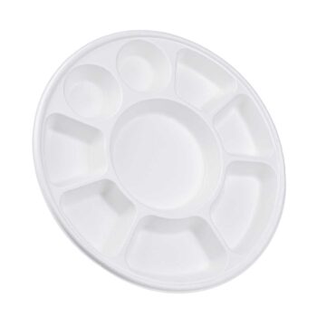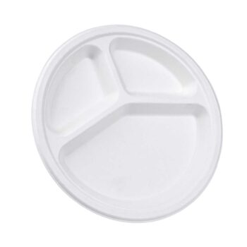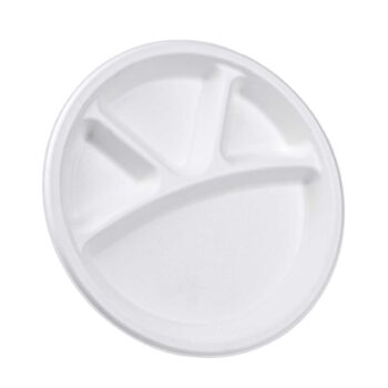 A sturdy sugarcane bagasse plate with three compartments, designed for complete meal serving. Ideal for catering and food service operations that require clean meal separation and reliable performance.